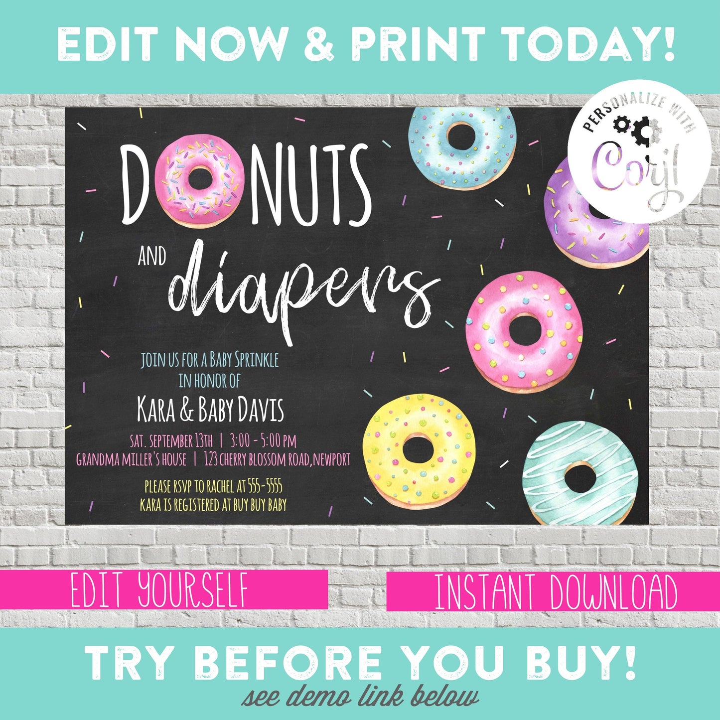Donuts and Diapers. Host an adorable diaper shower with this fun and colorful invitation. Works well for boy or girl.