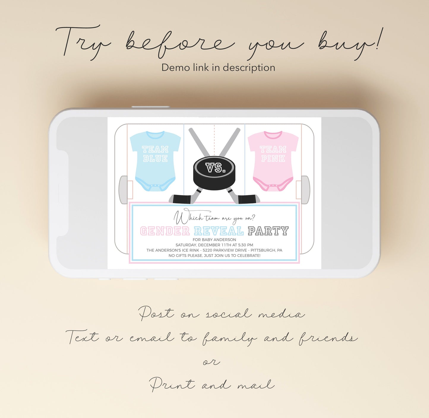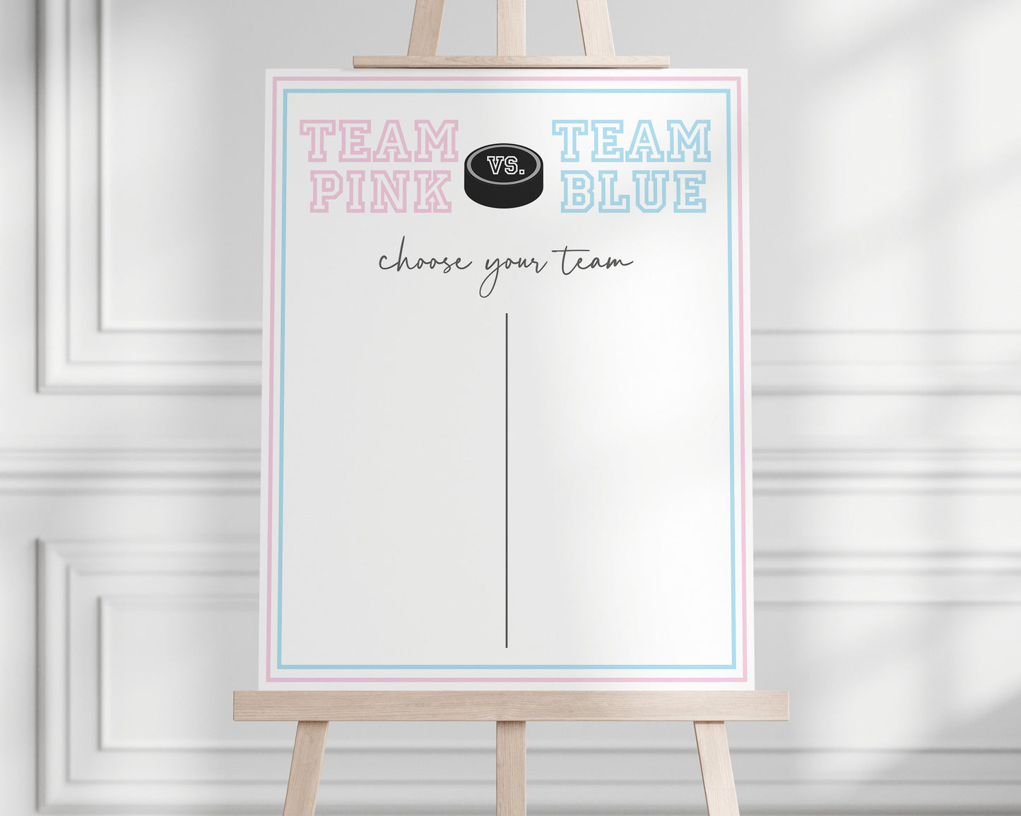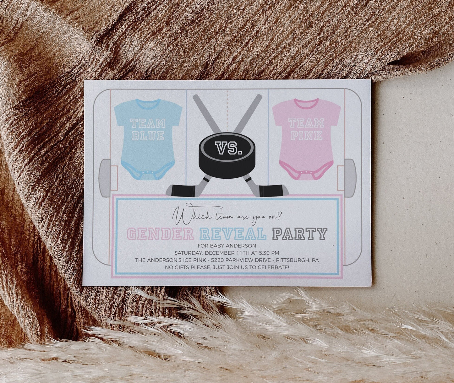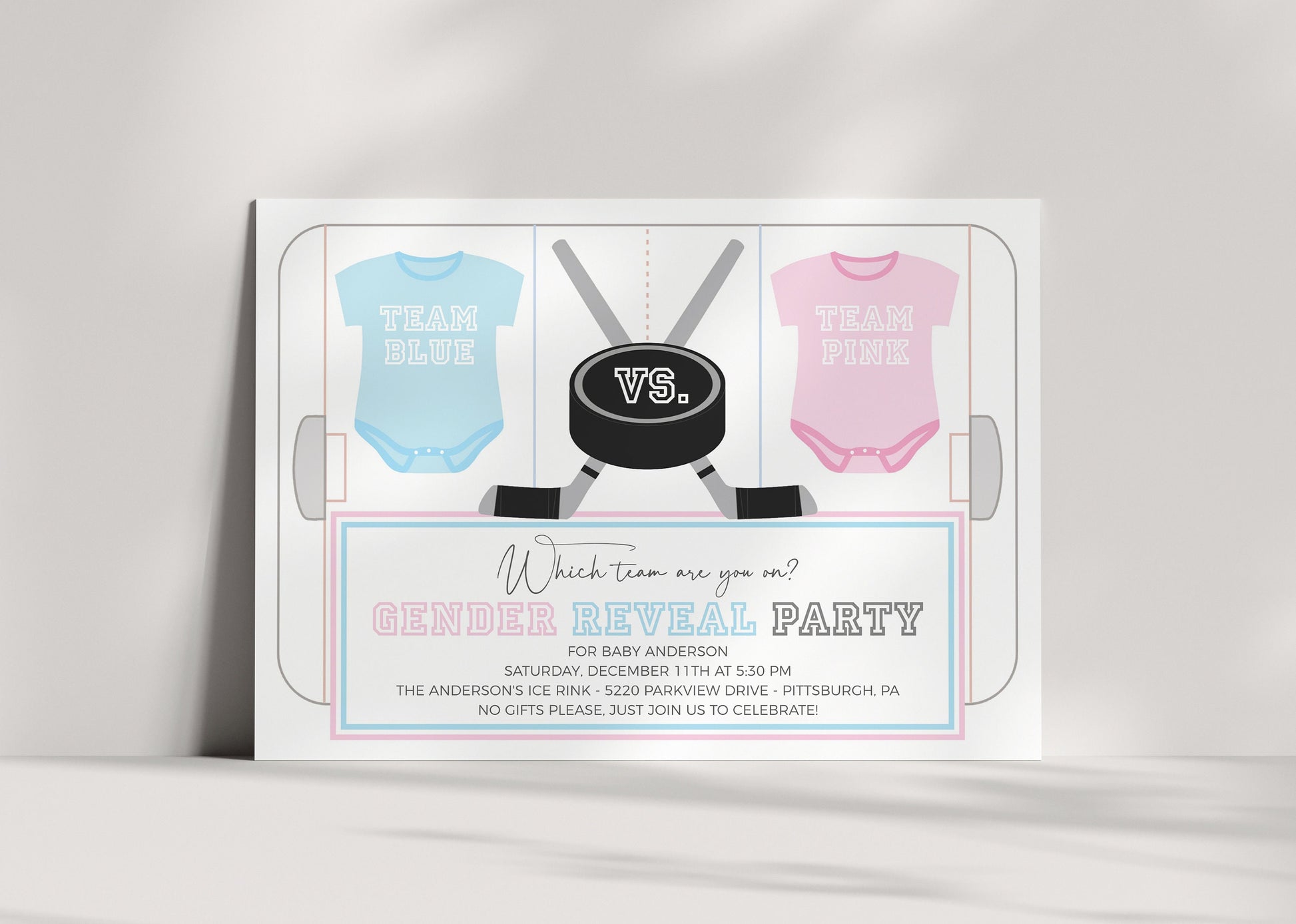 The invitation features a modern hockey design, setting the stage for the big moment when you announce whether it's Team Pink or Team Blue taking the lead.