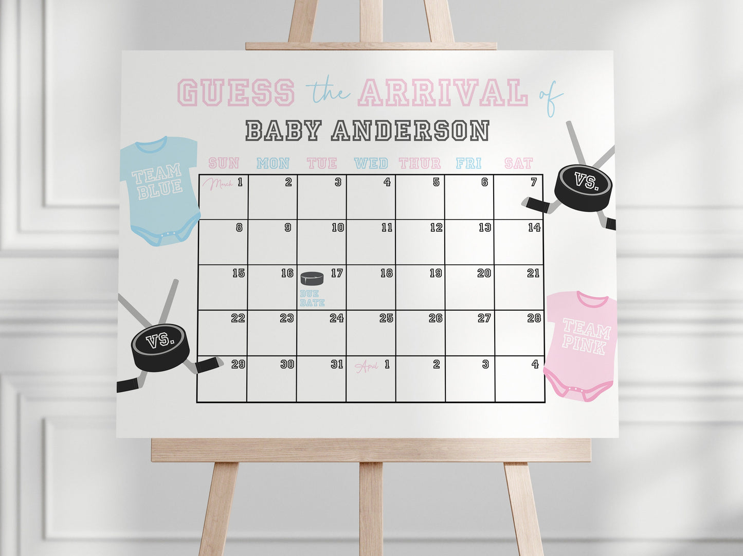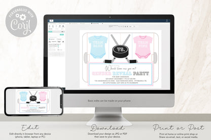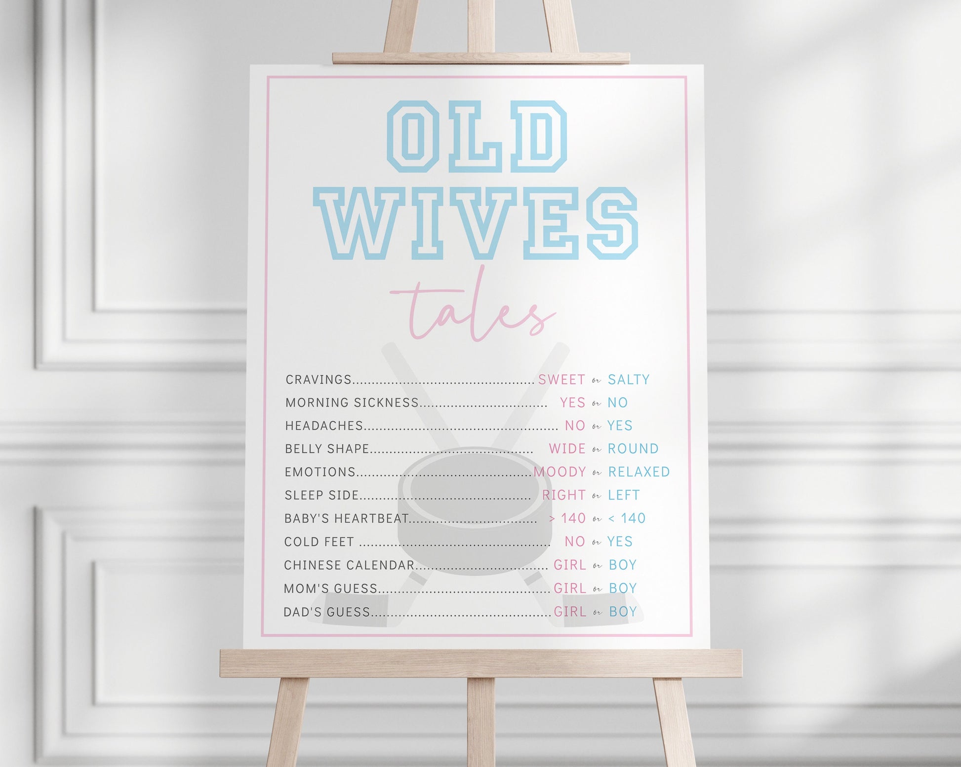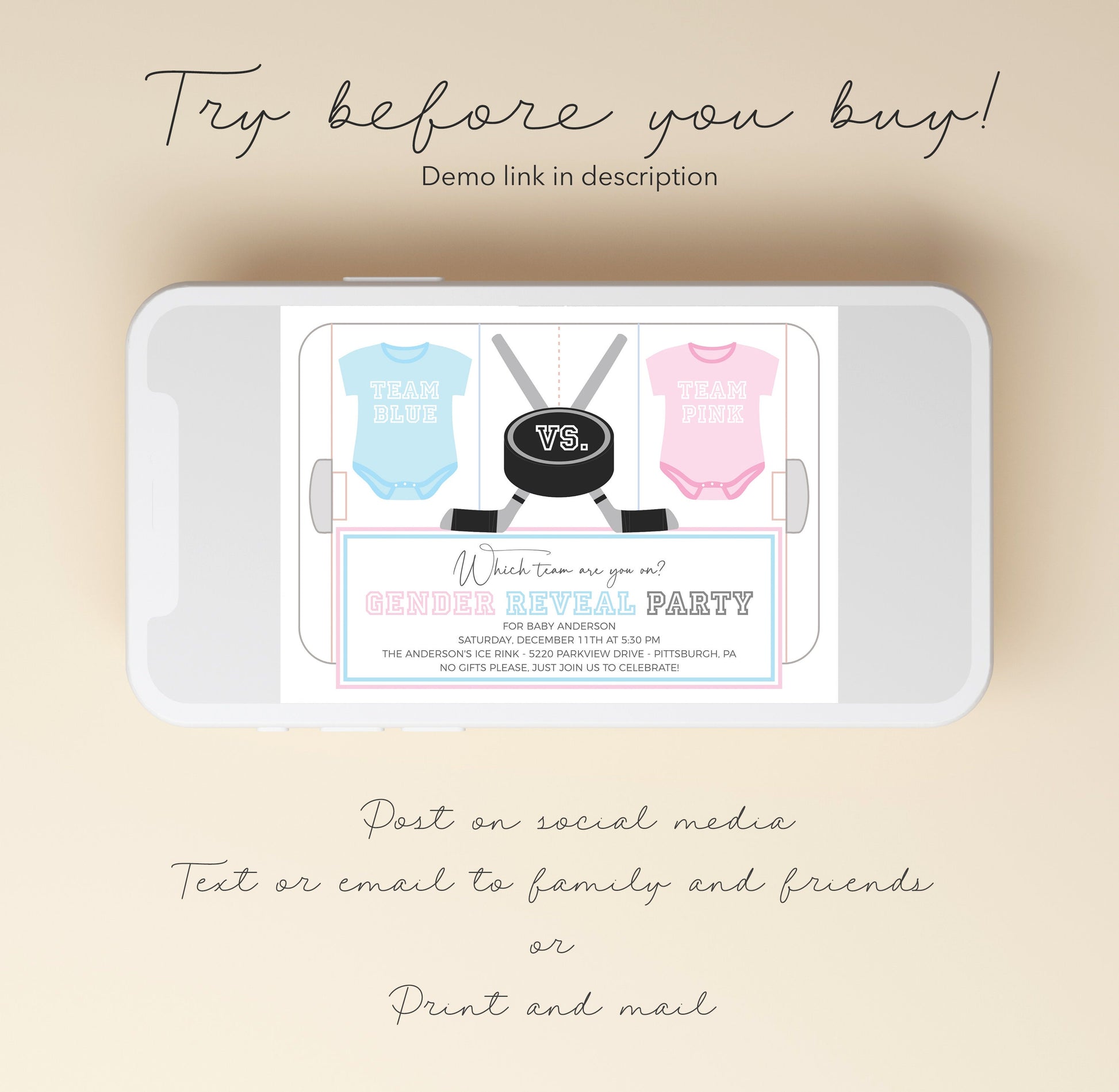 The invitation features a modern hockey design, setting the stage for the big moment when you announce whether it's Team Pink or Team Blue taking the lead.