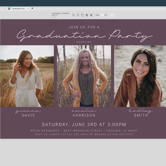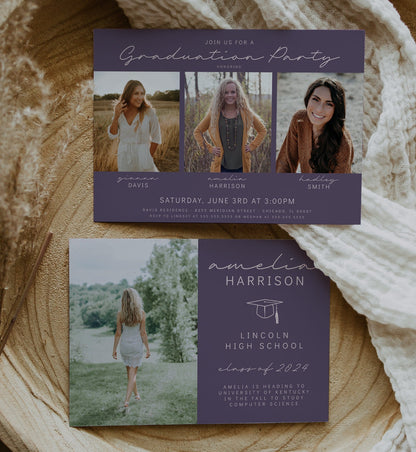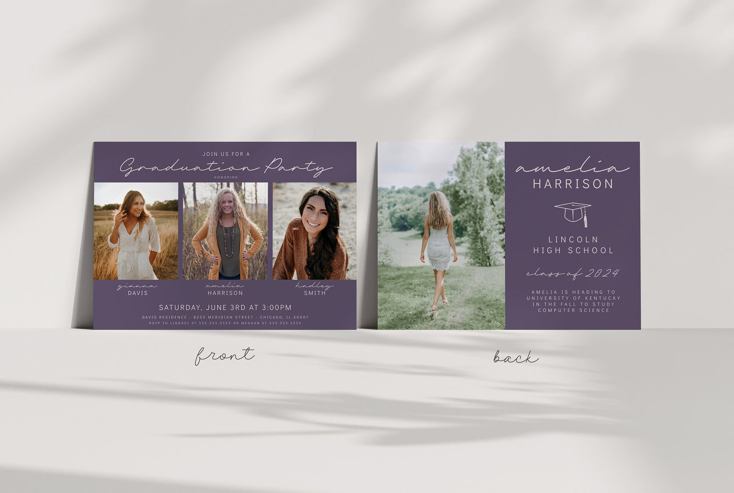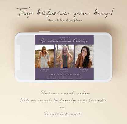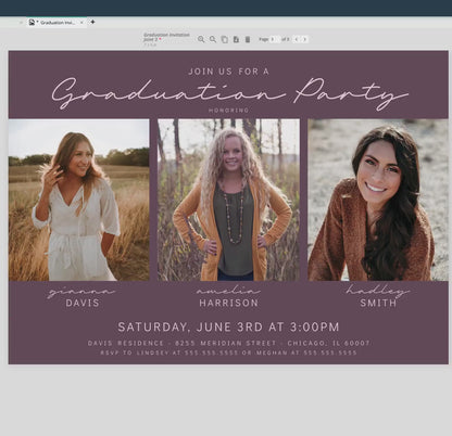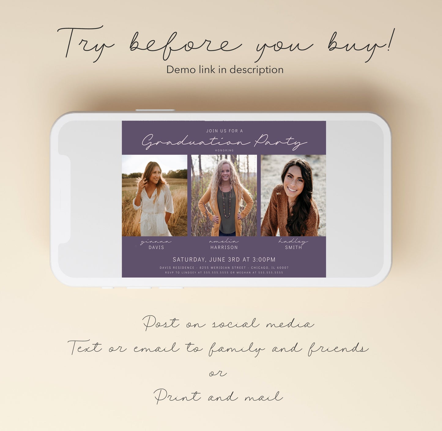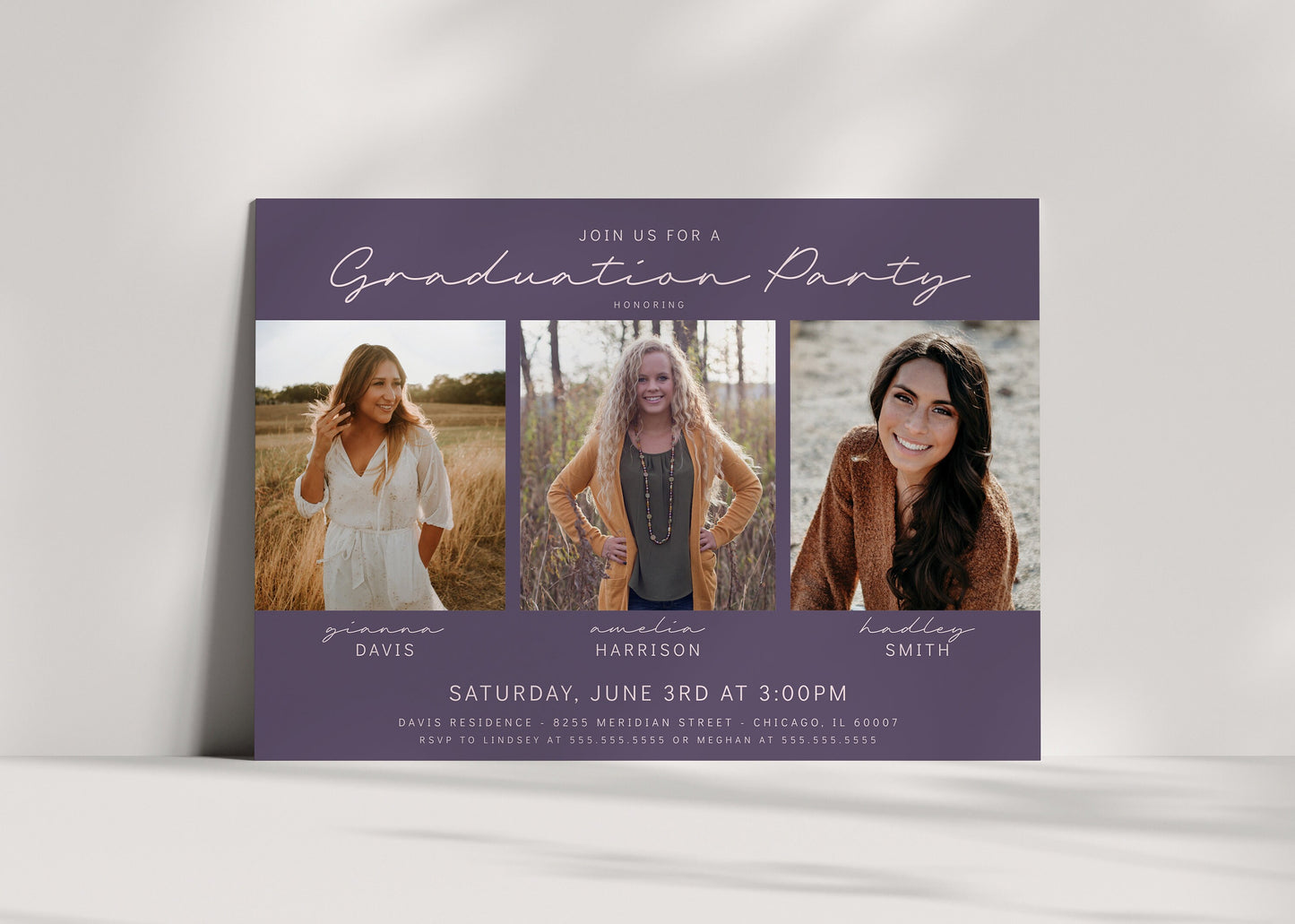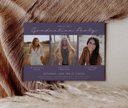 π Joint Graduation Party Invitation for 3 friends or siblings. Three individual photos on front with party event details.