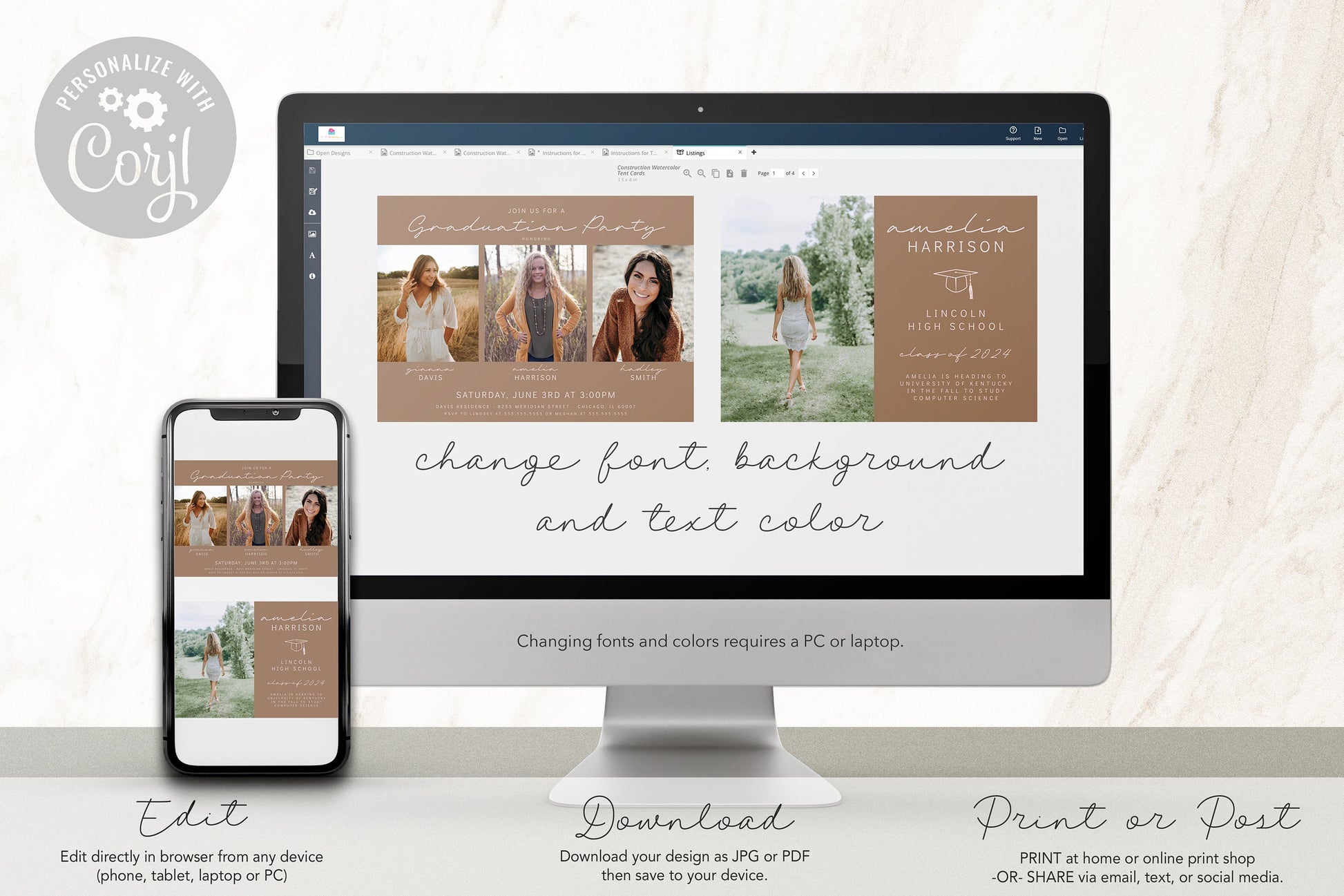 π Self-editable invitation allowing you to customize all colors (background, wording, graphics) to match your school colors or event theme - making it an ideal fit for any graduation party theme.