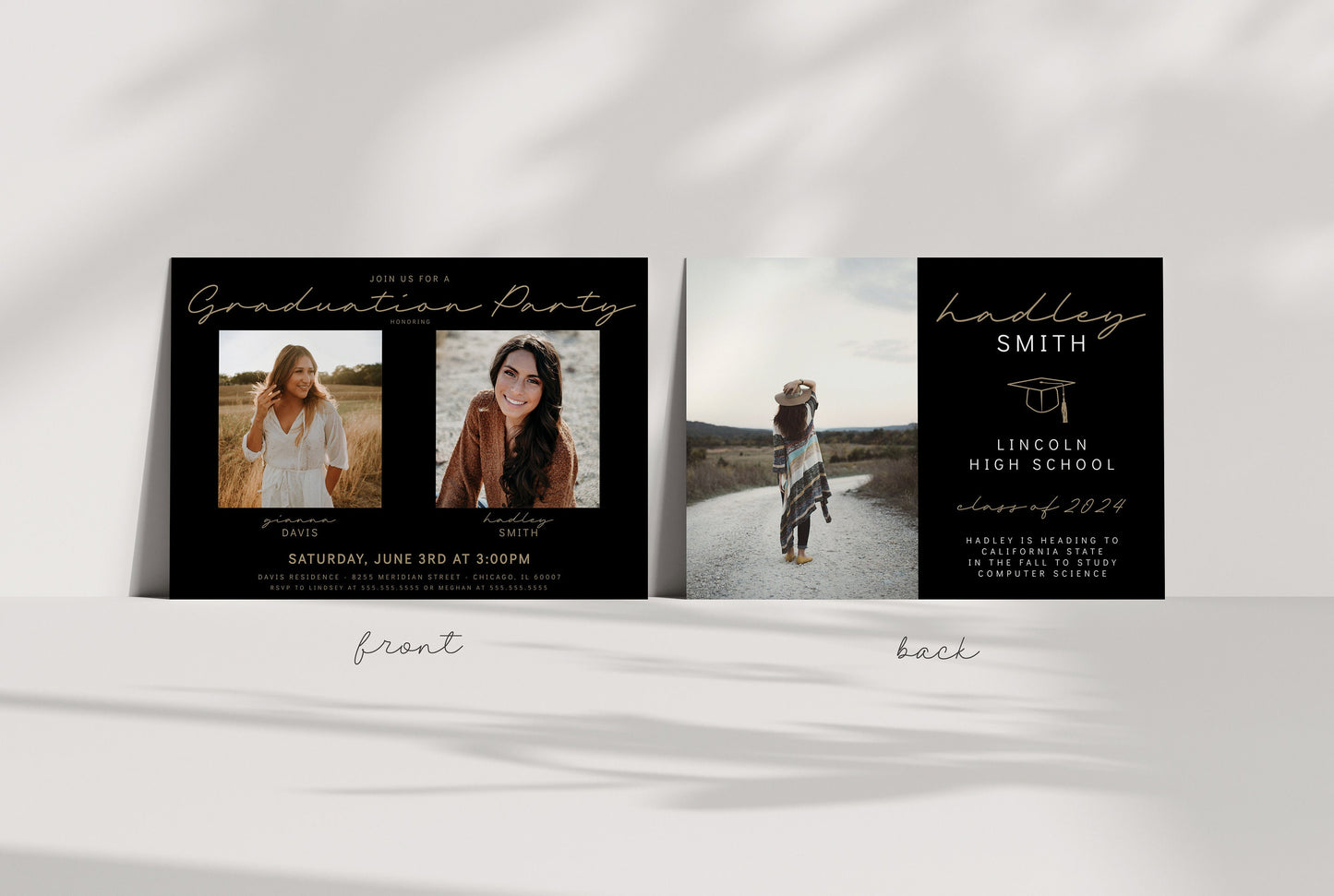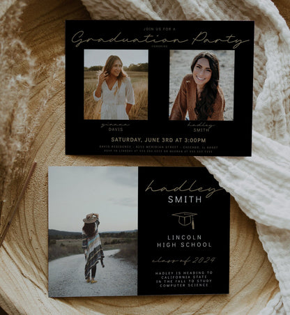 π Joint Graduation Party Invitation for 2 friends, siblings or twins. Two individual photos on front with party event details.