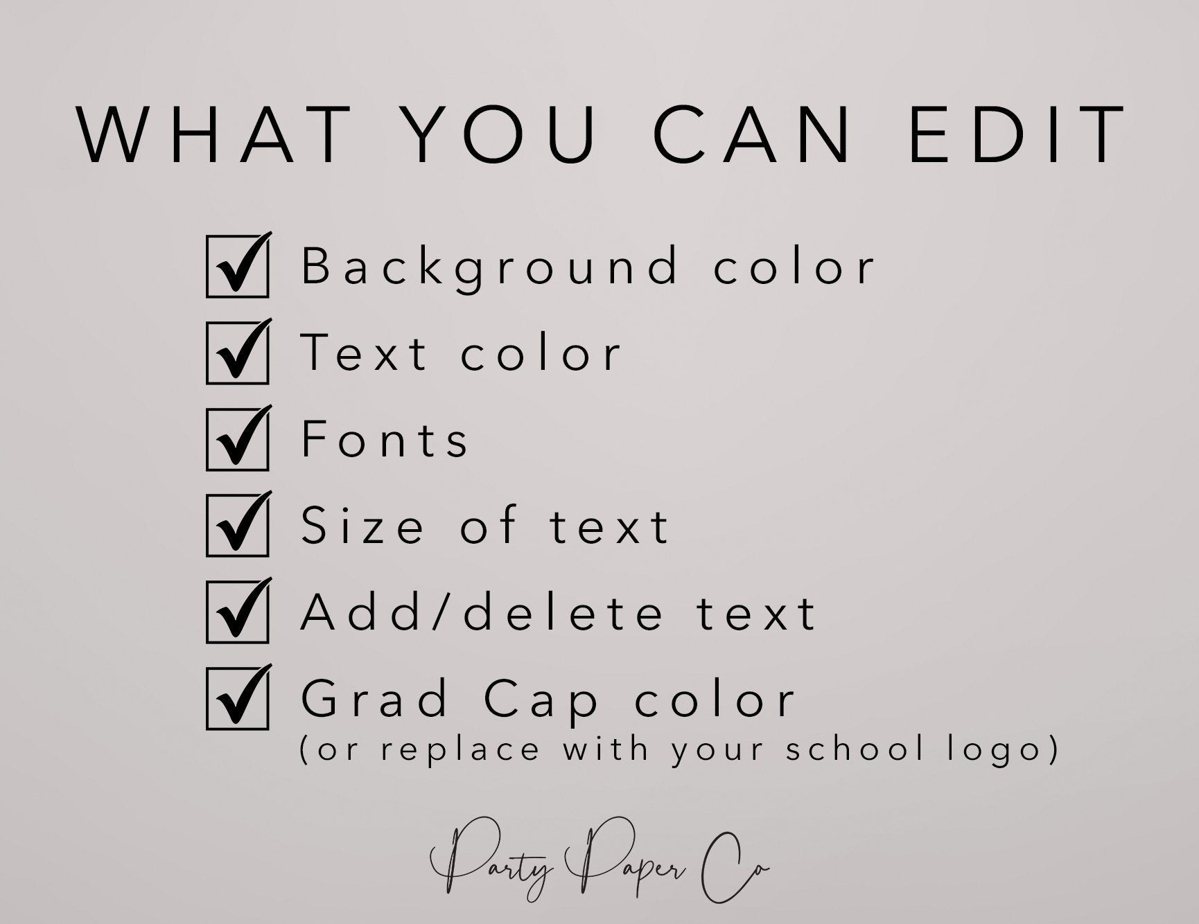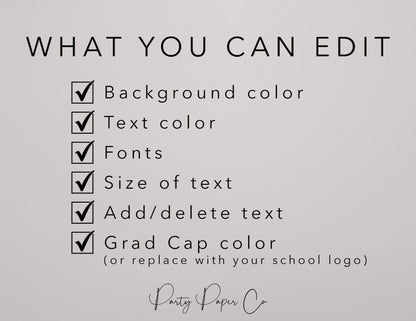 π Self-editable invitation allowing you to customize all colors (background, wording, graphics) to match your school colors or event theme - making it an ideal fit for any graduation party theme.