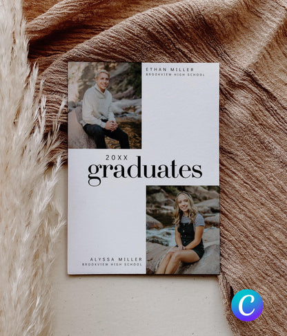 π Joint Graduation Party Invitation for 2 friends, siblings or twins. Two individual photos on front with party event details.