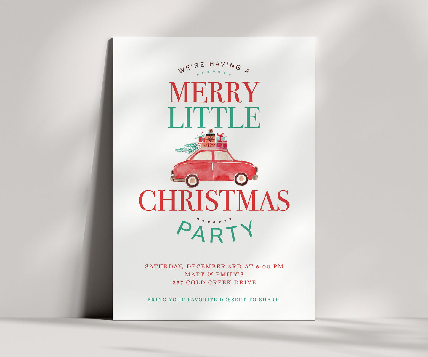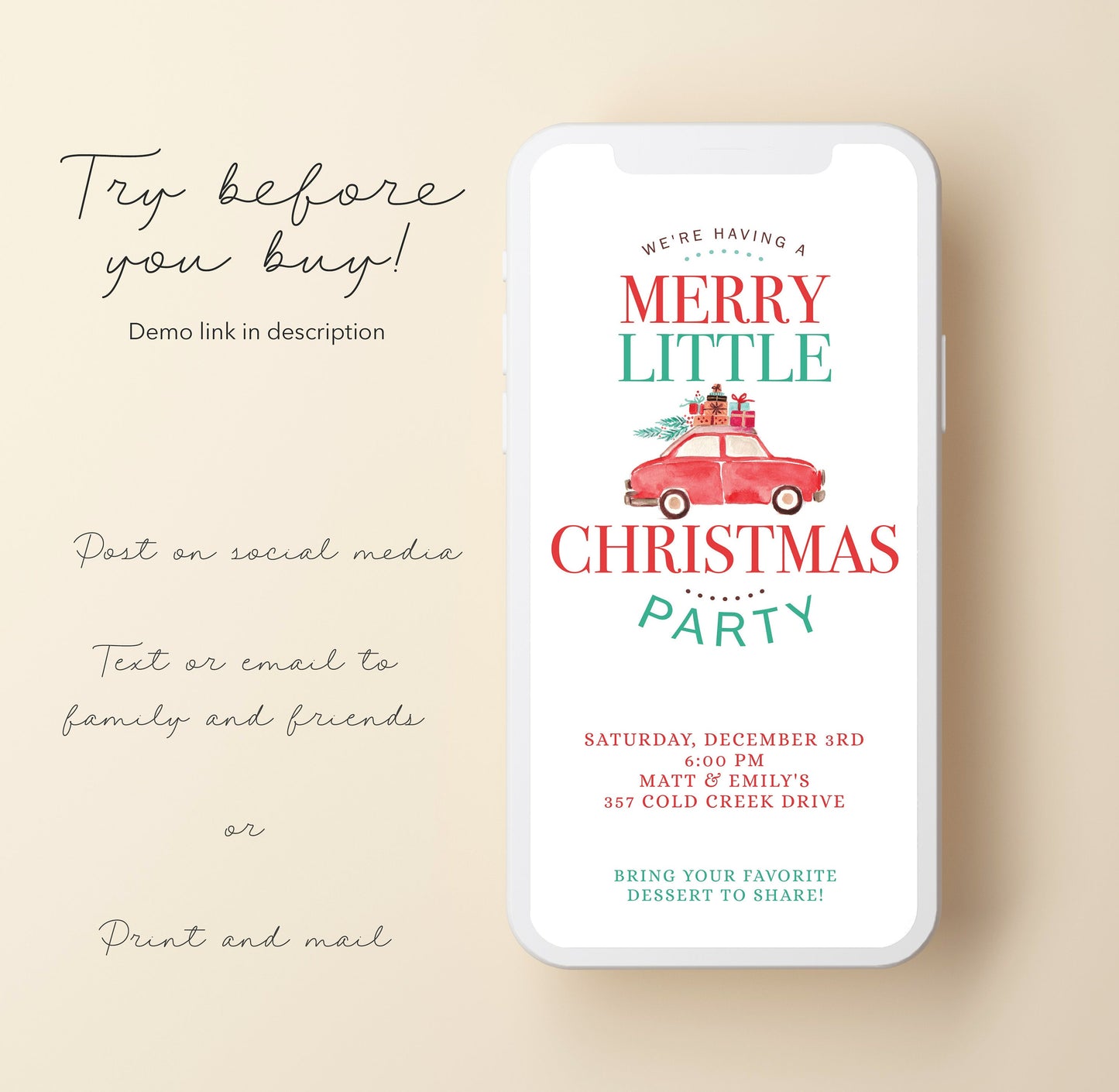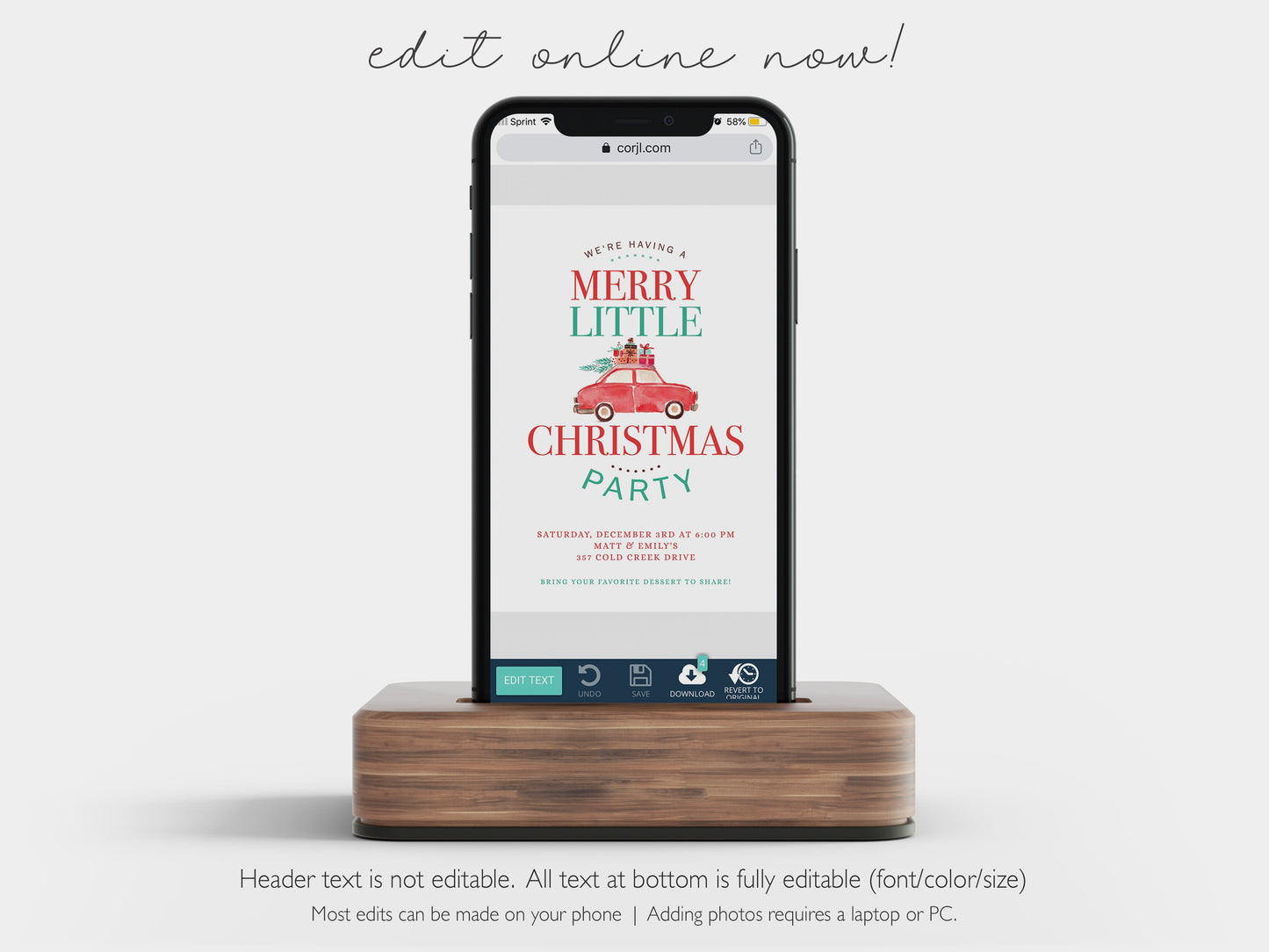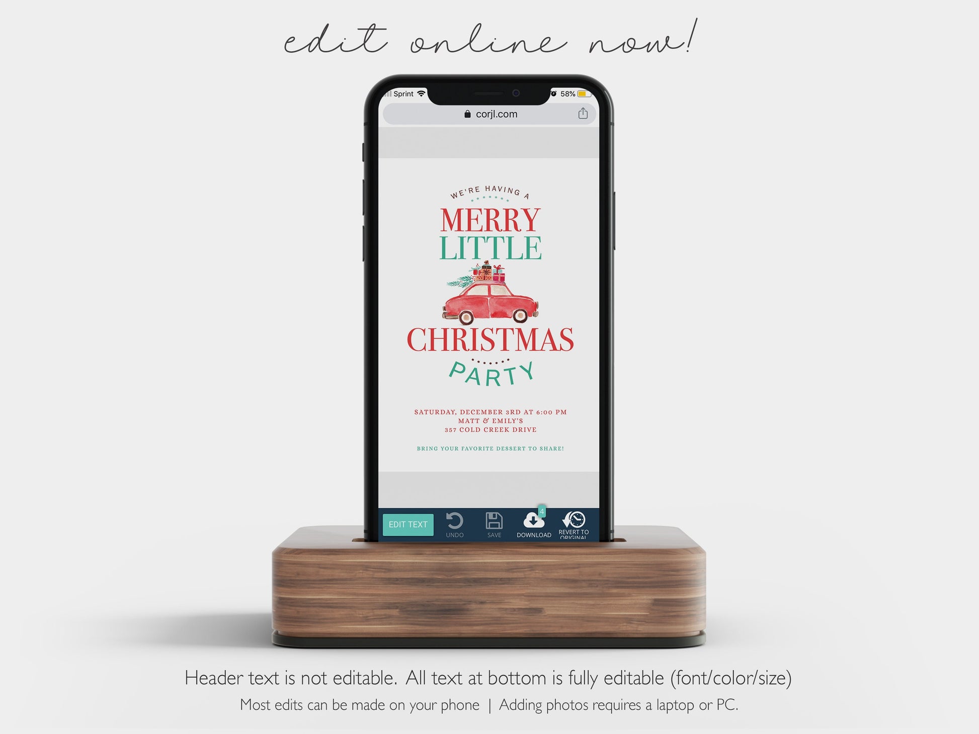 Main header text (We're Having a Merry Little Christmas Party) is not editable. All other text below if fully editable (color/font/size).