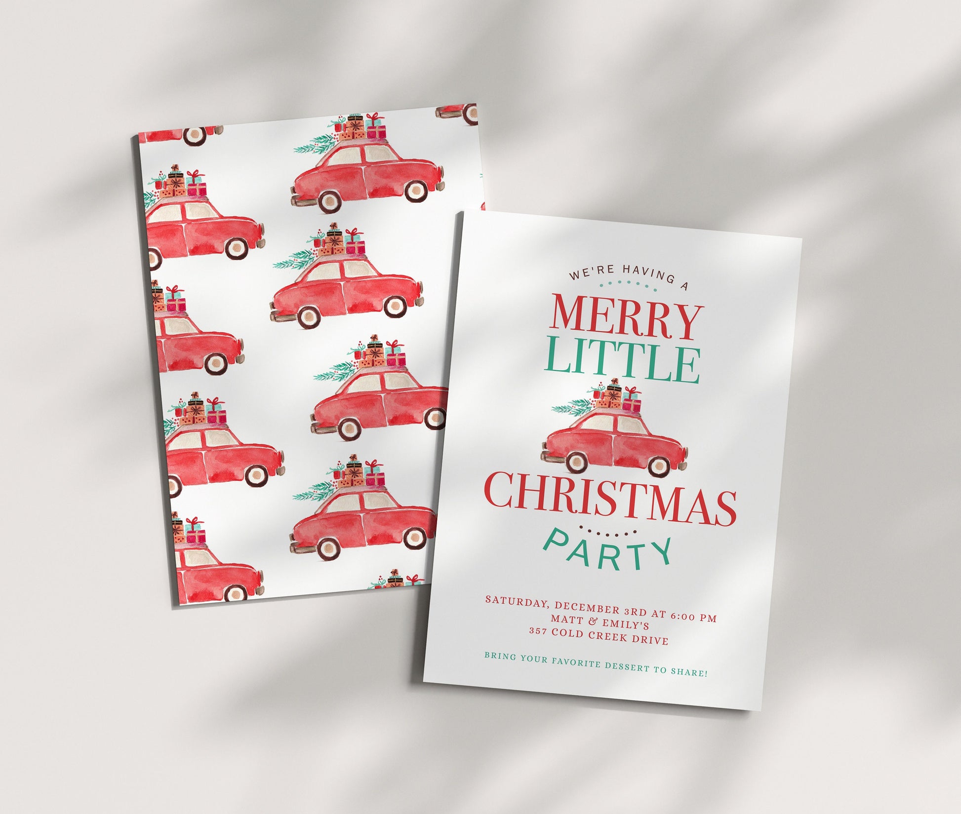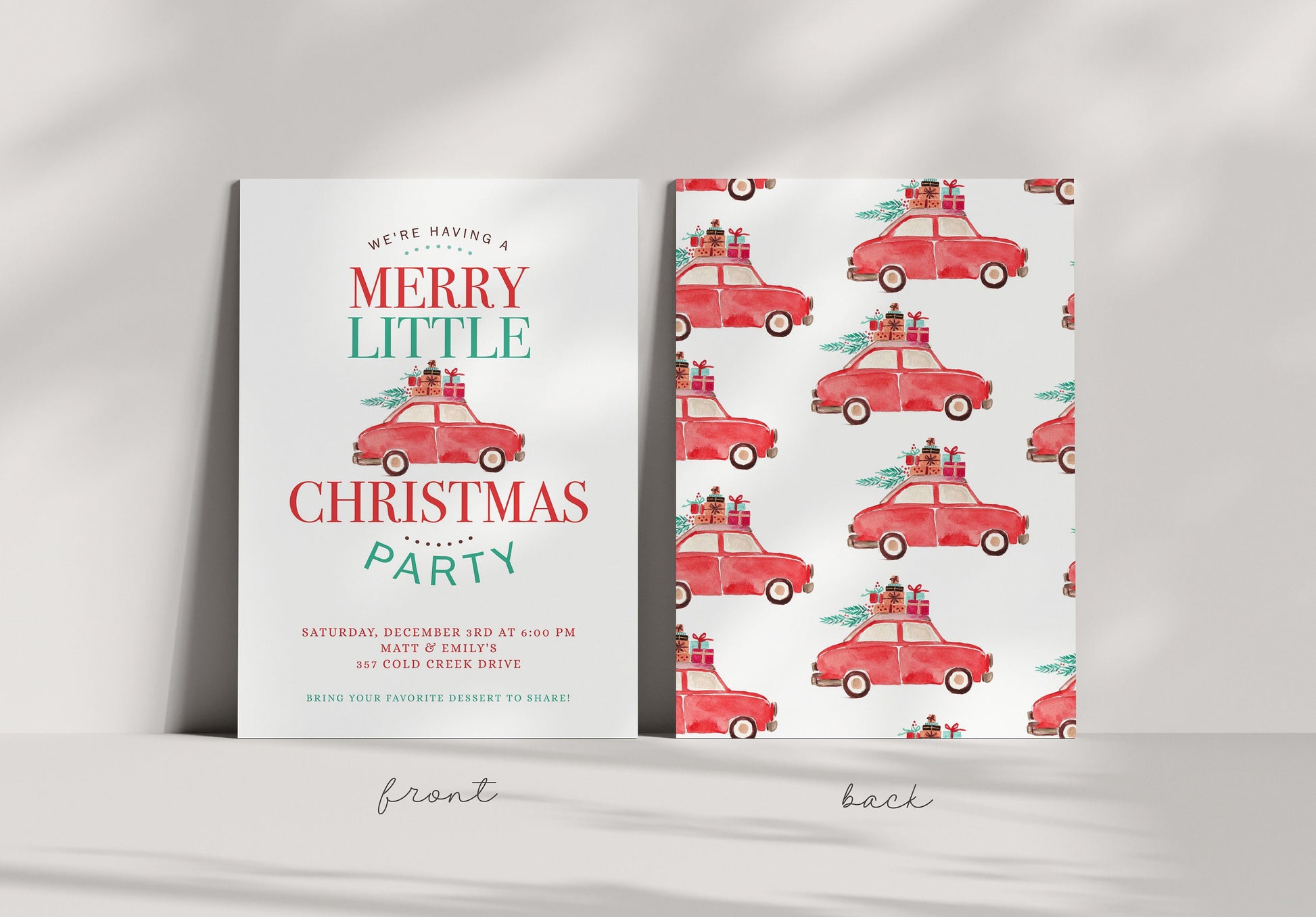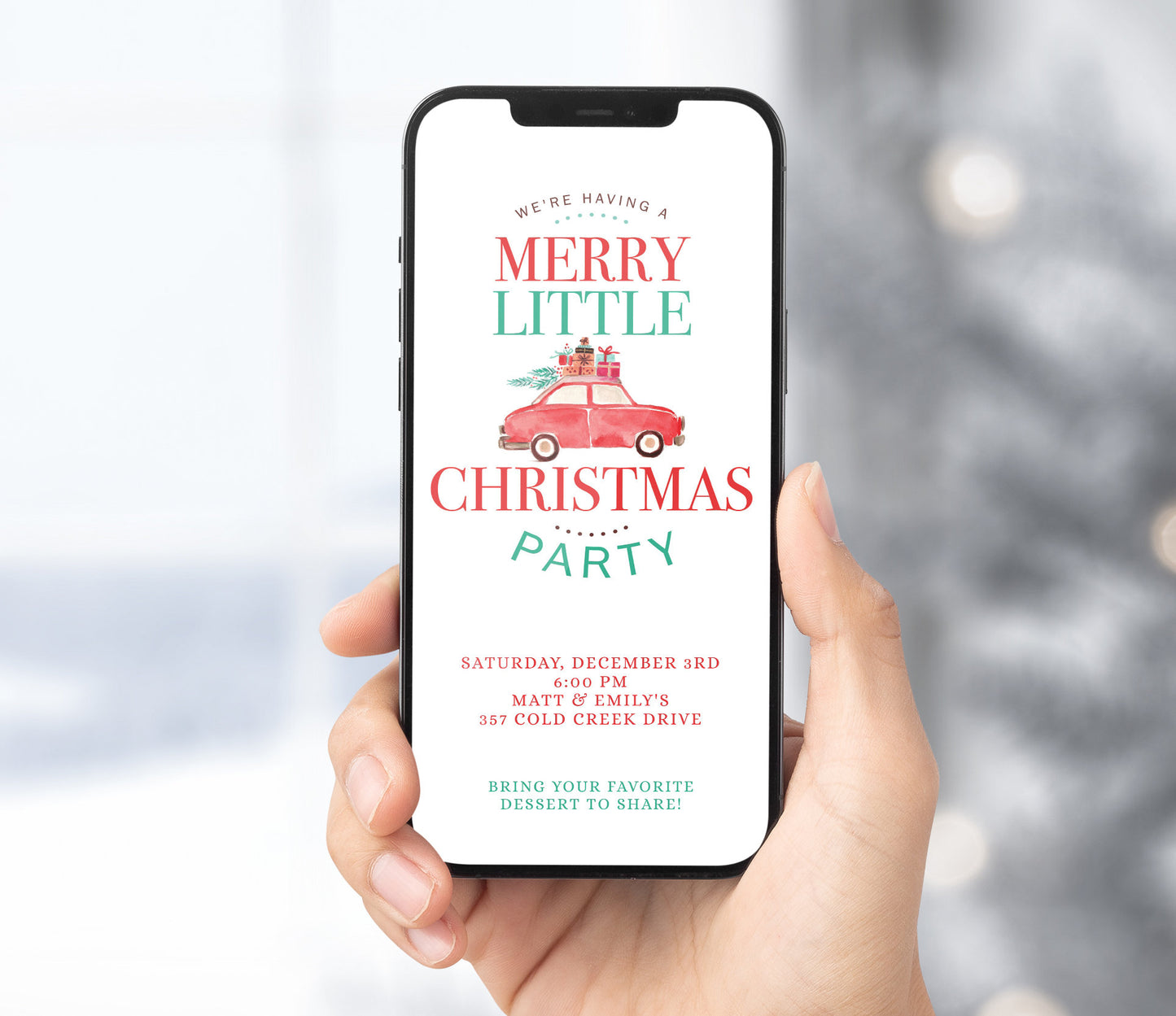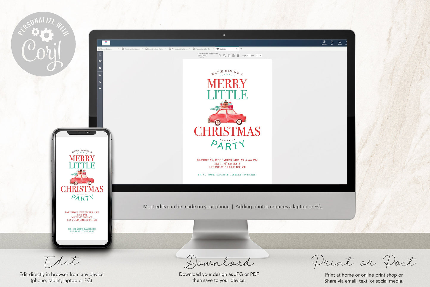 Main header text (We're Having a Merry Little Christmas Party) is not editable. All other text below if fully editable (color/font/size).