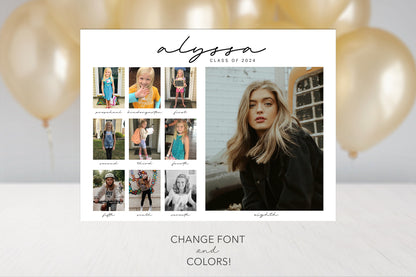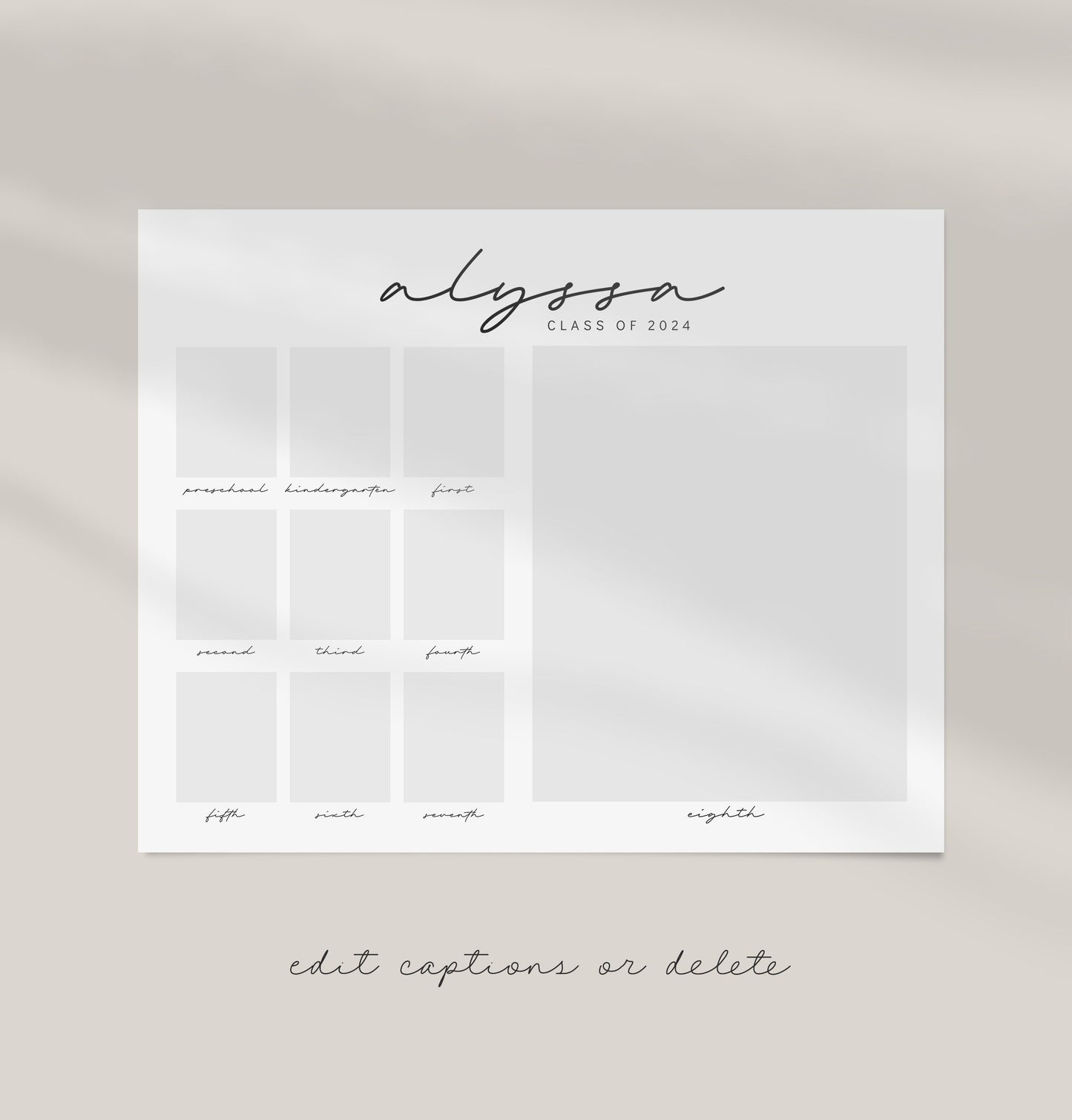 10 photo slots you can personalize for grades Preschool through 8th grade or, edit/delete captions to best suit your ten pictures!