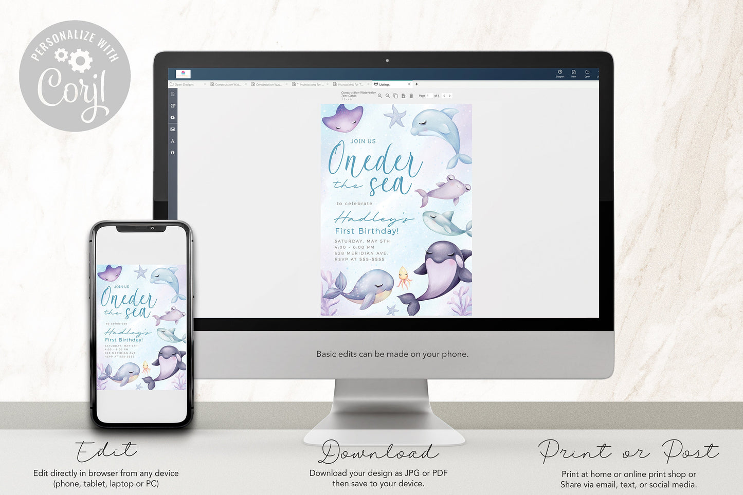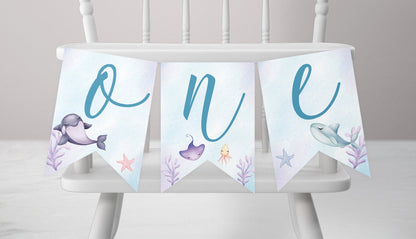 Invite friends and family to your child's ONEder the Sea 1st birthday party with this adorable editable invitation.