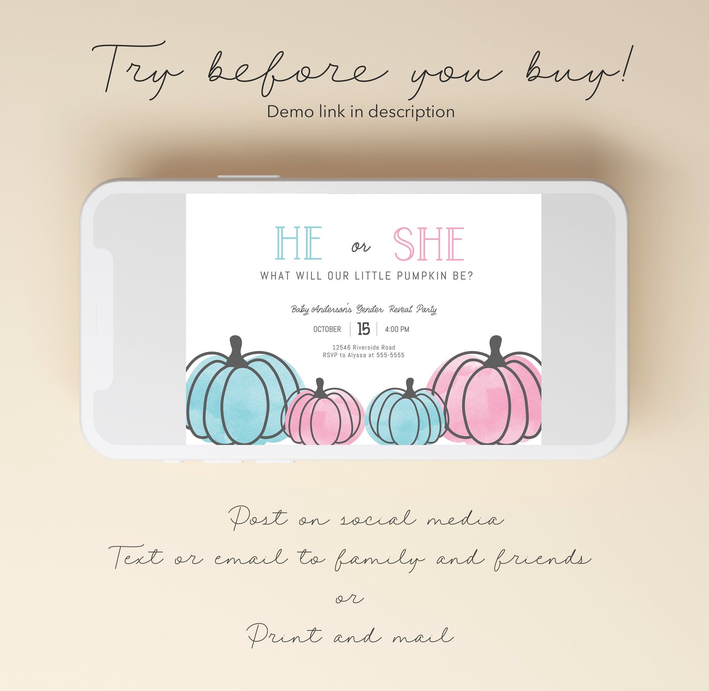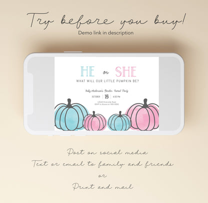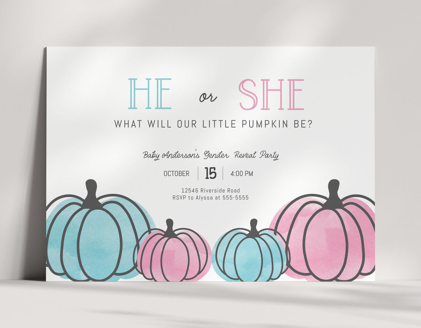 Modern Pumpkin Gender Reveal Party Invitation, perfect for October Baby Reveal Party. All text fully editable (font, size, color).