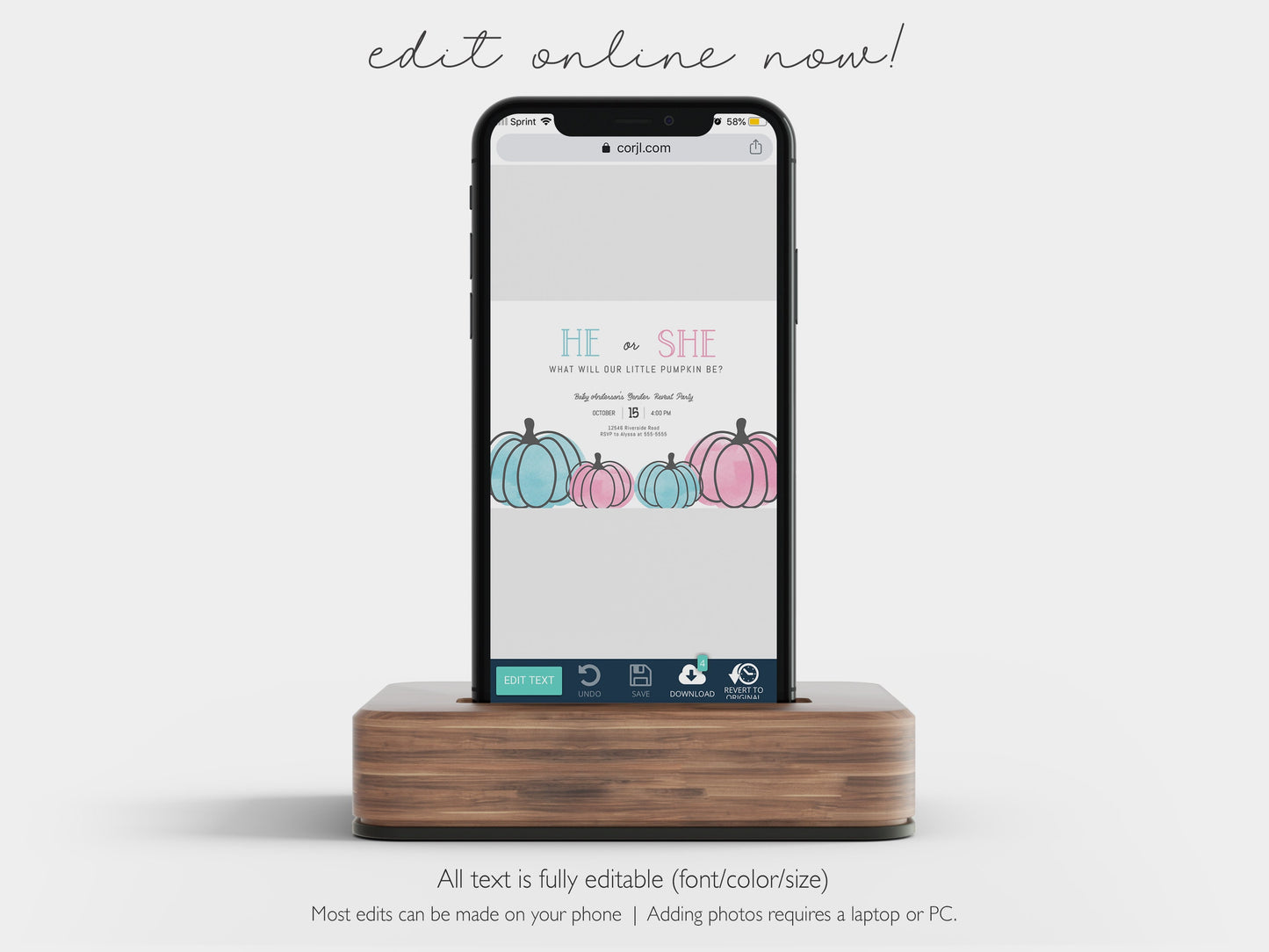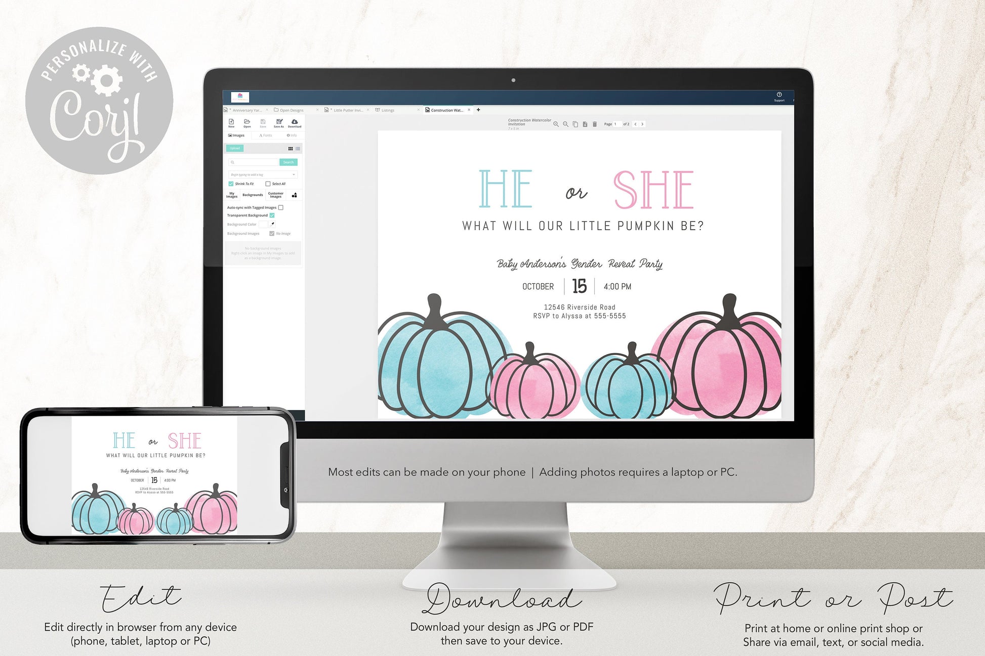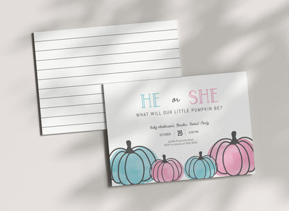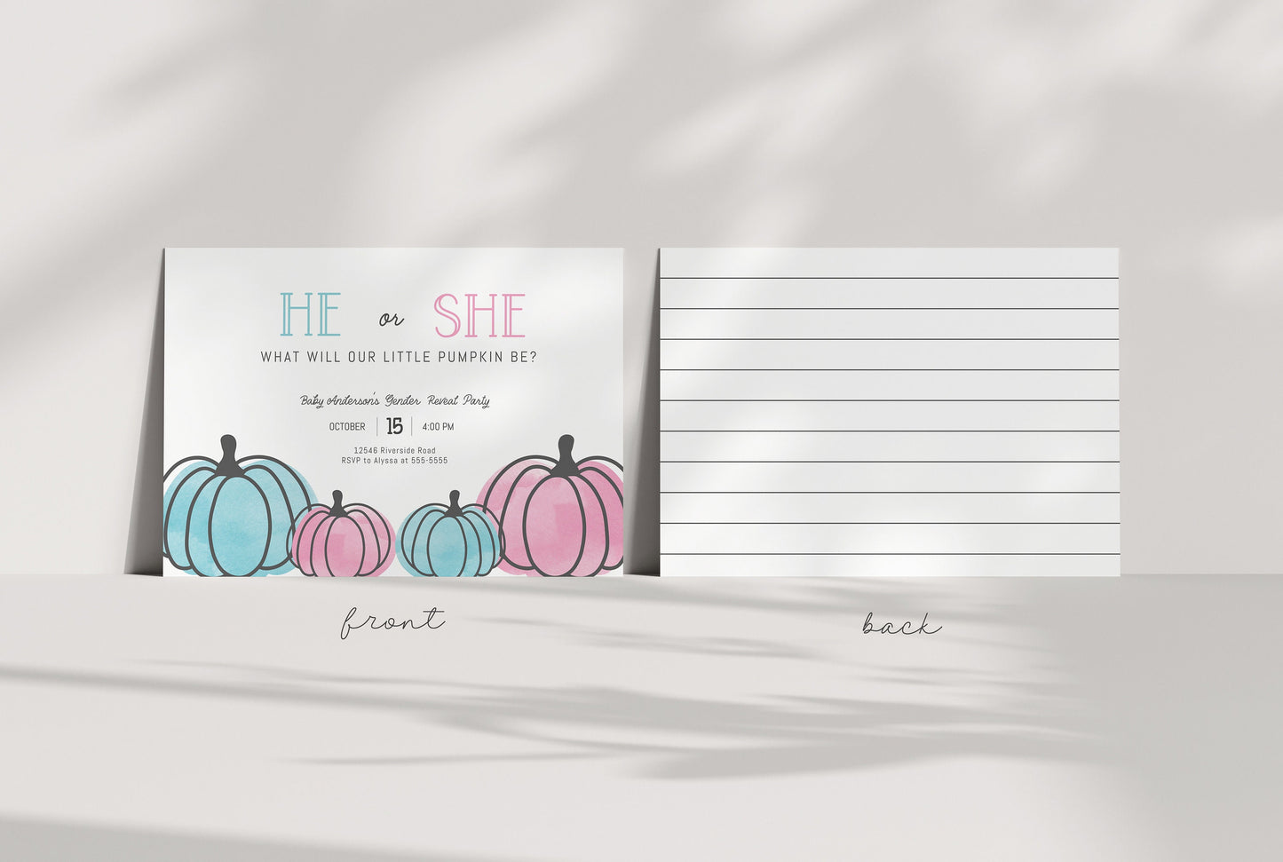 Modern Pumpkin Gender Reveal Party Invitation, perfect for October Baby Reveal Party. All text fully editable (font, size, color).
