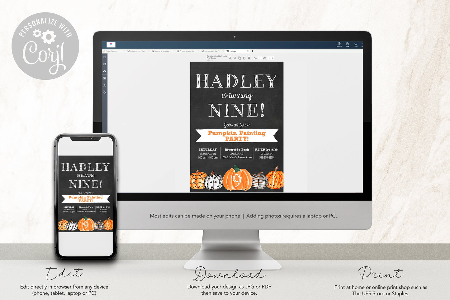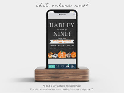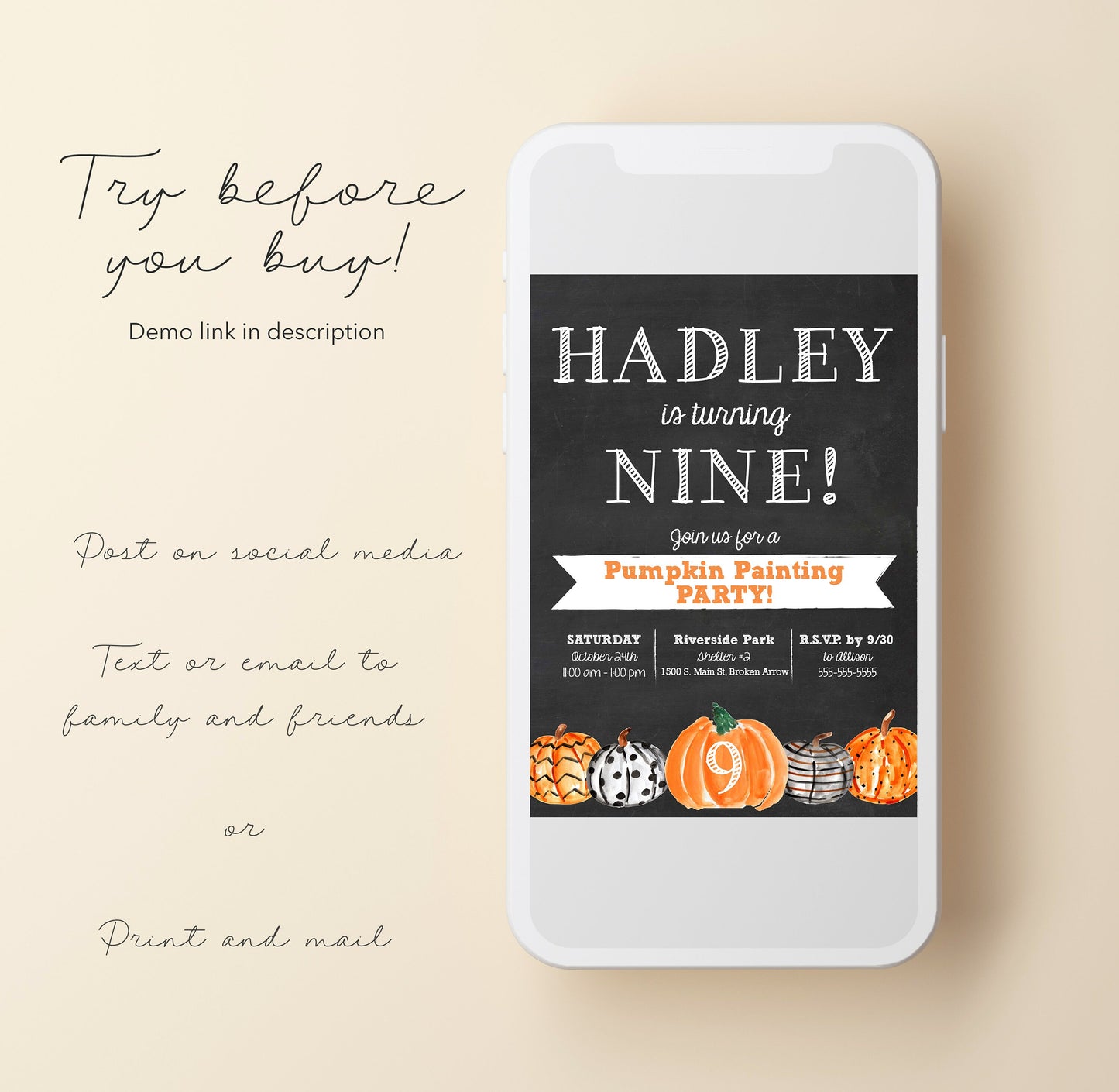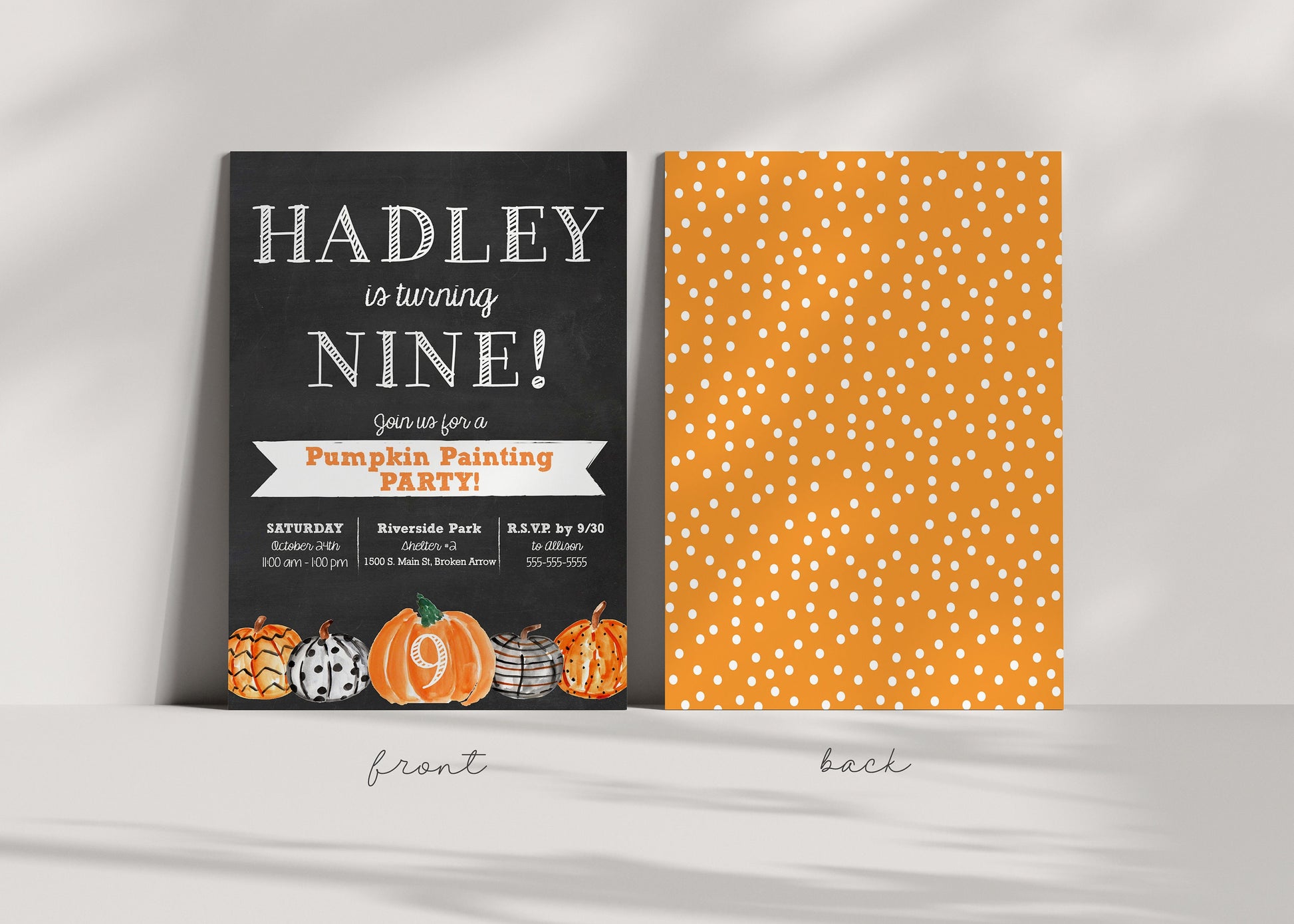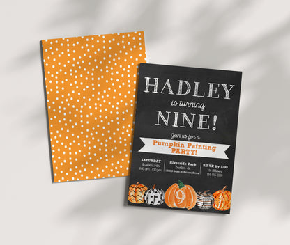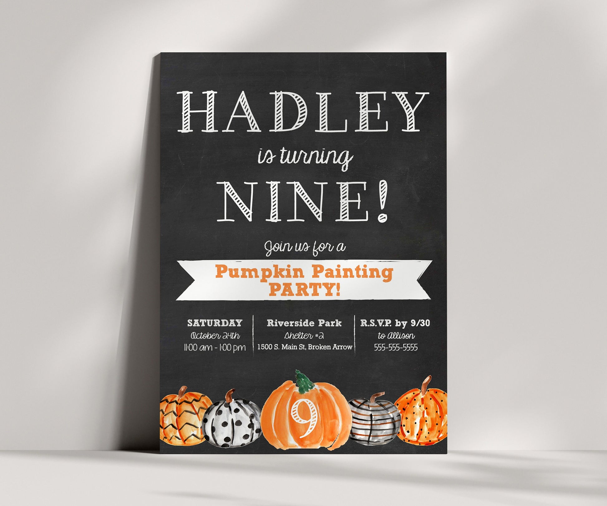 Pumpkin Painting Party Invitation with Chalkboard background.