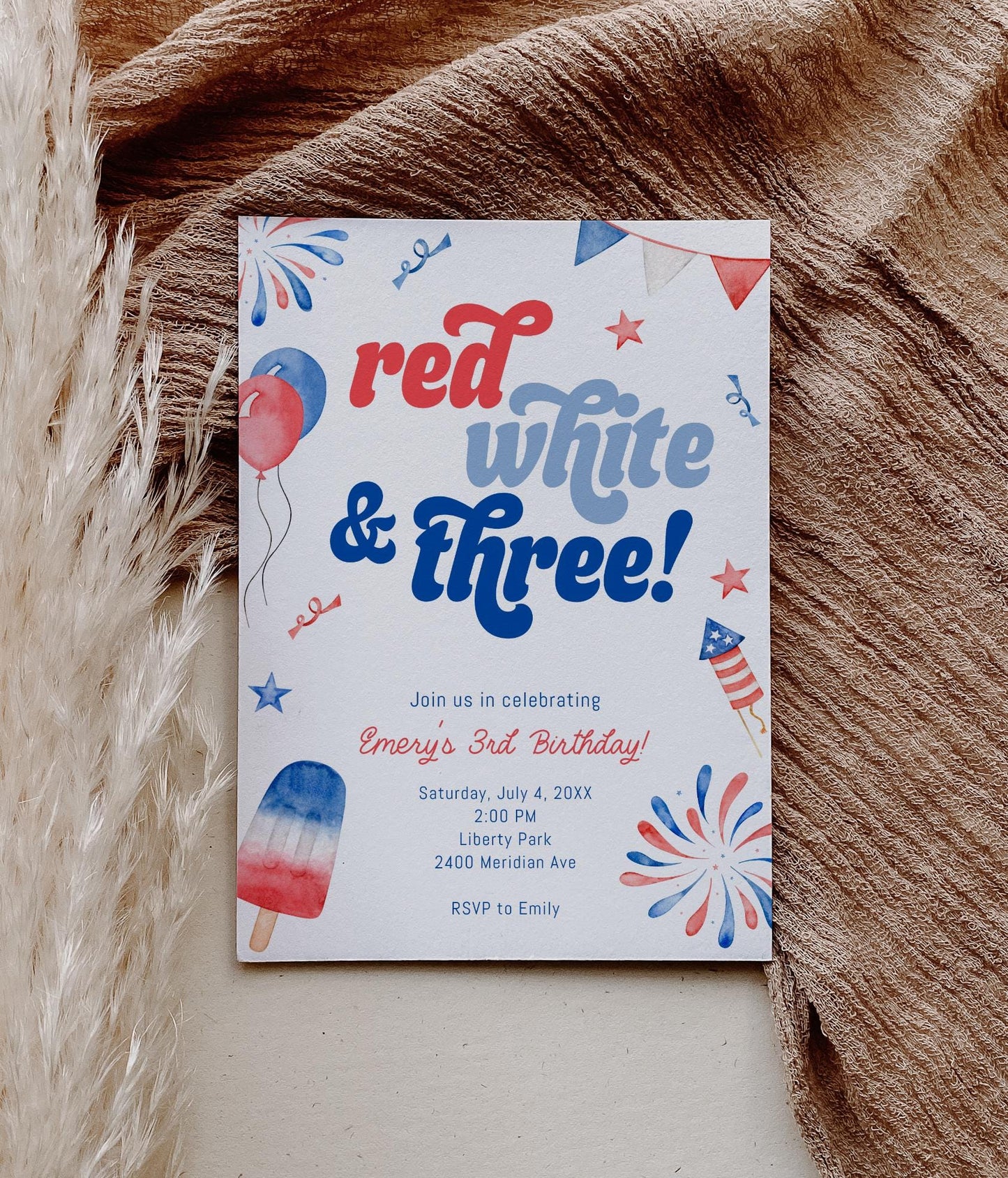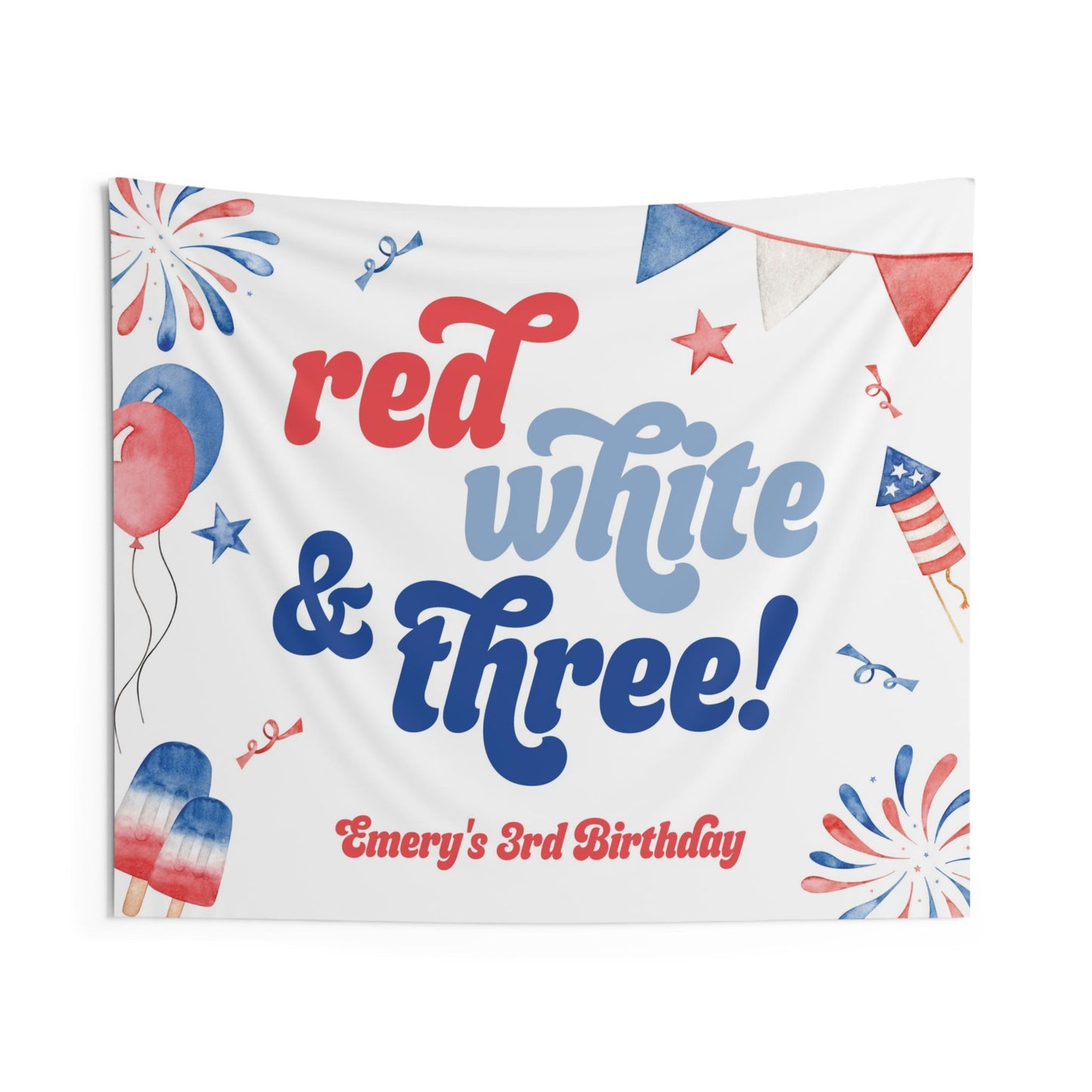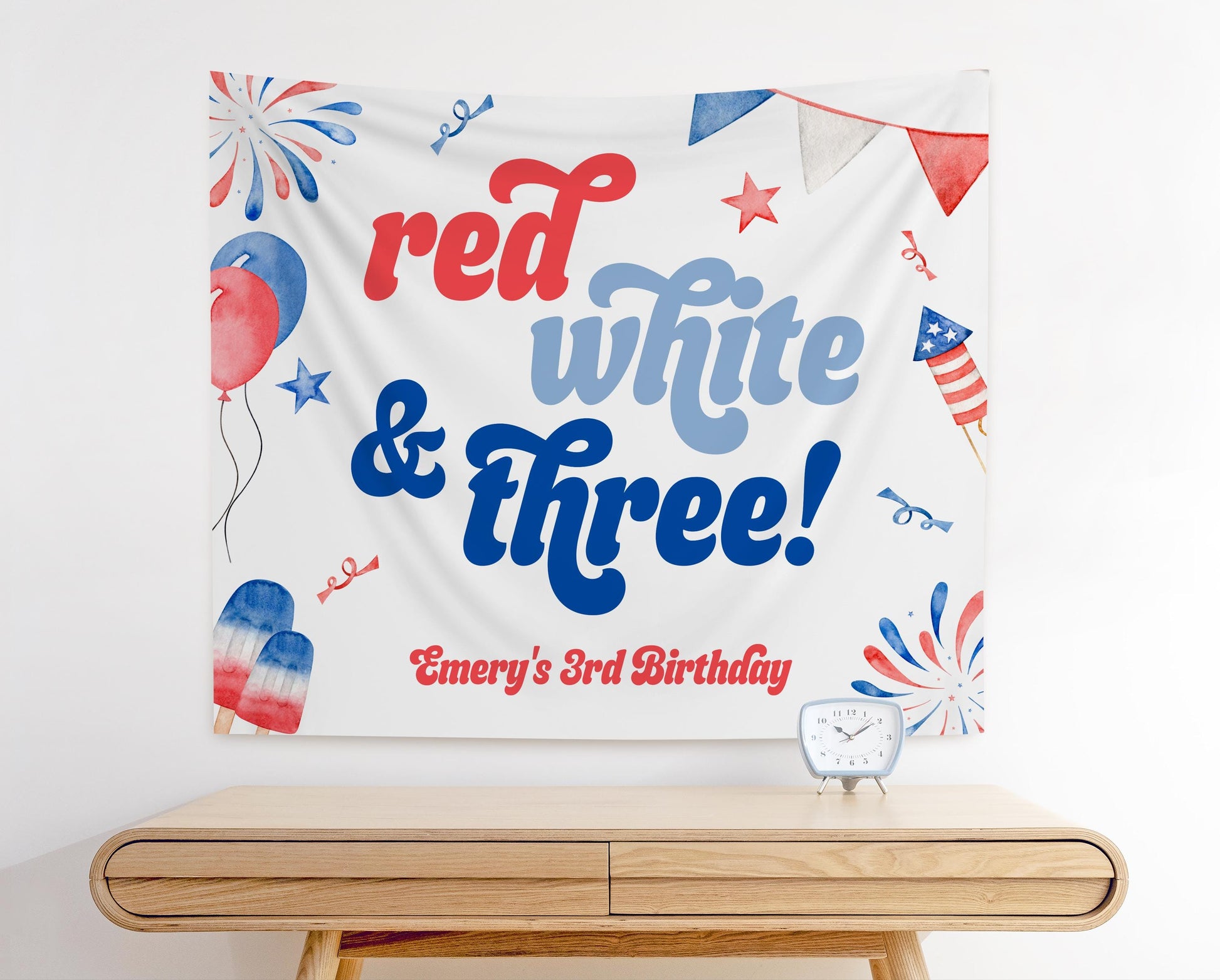Red White and THREE 3rd birthday party fabric backdrop banner is perfect to display behind cake/food table, photo booth or to help decorate a wall to tie in your red white and blue birthday theme.