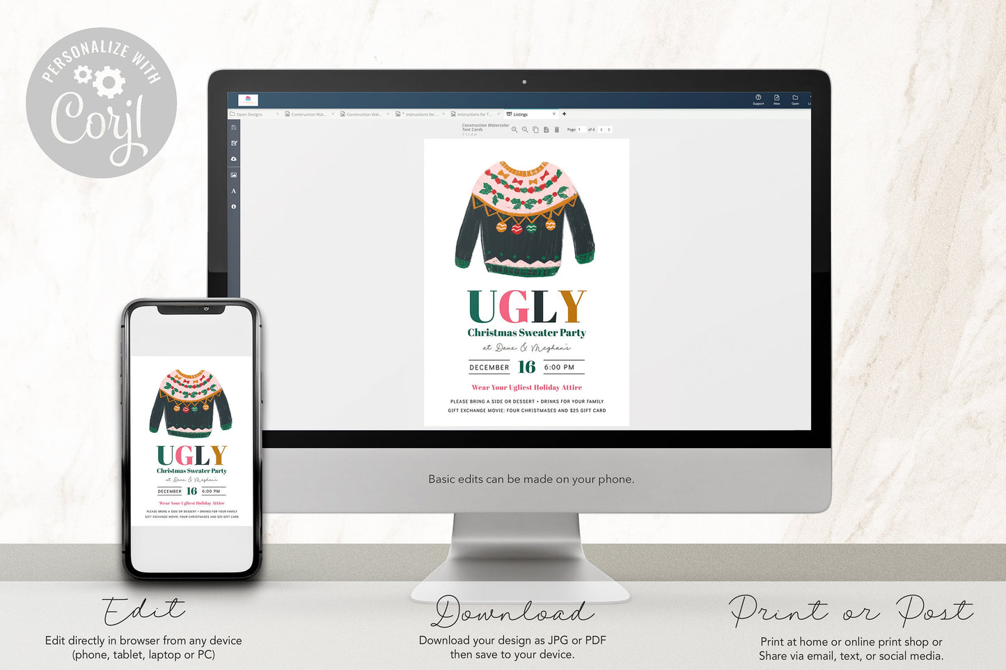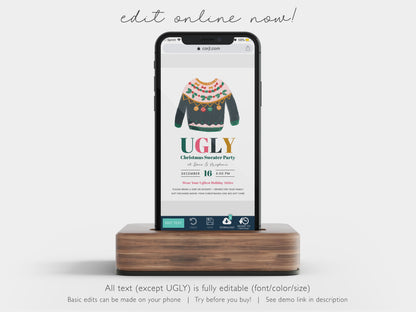 Make your event stand out with our contemporary and customizable Ugly Christmas Sweater invitation template.